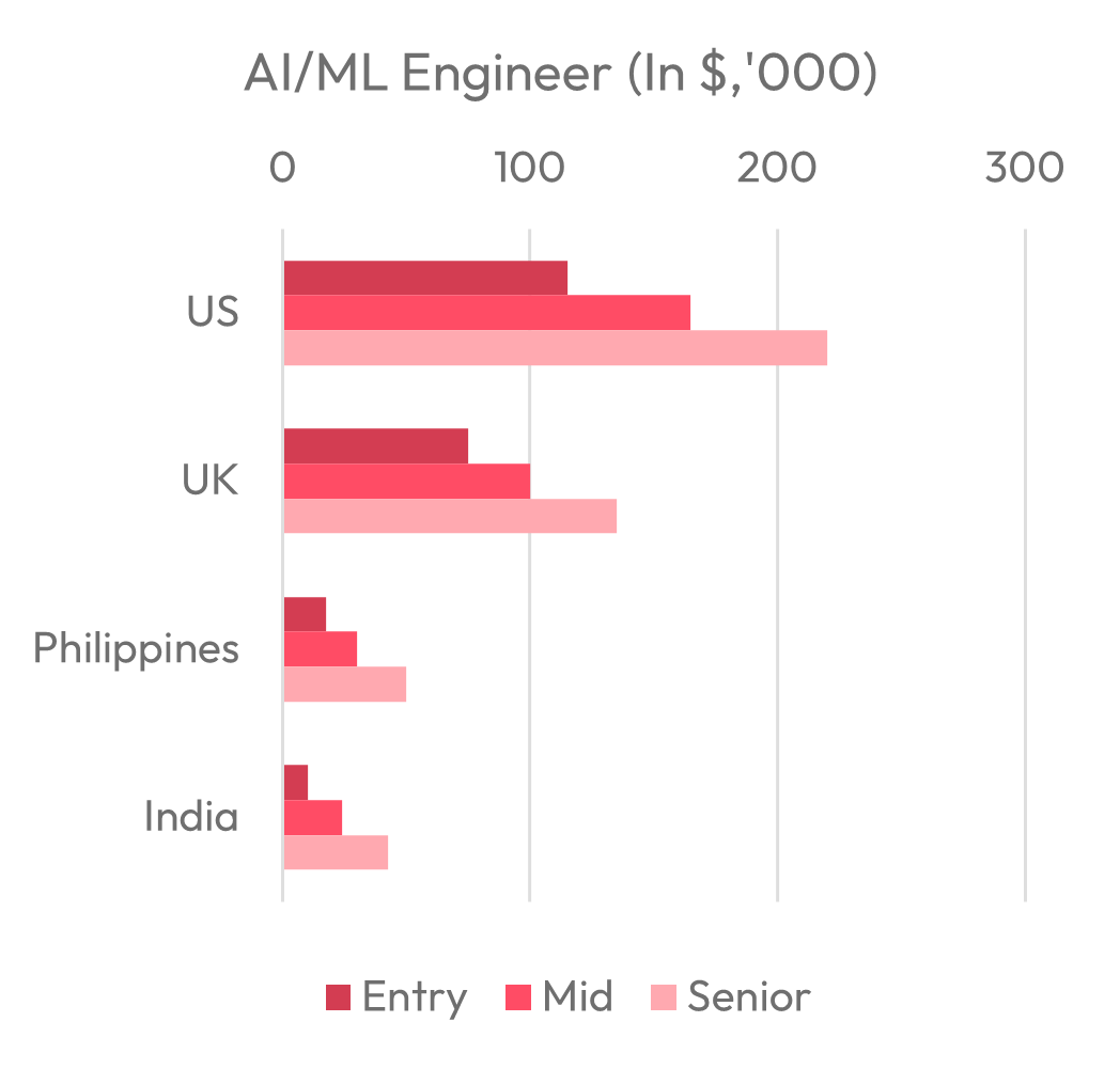 The demand for AI talent is outpacing the supply globally. Emerging economies such as the Philippines and Mexico exhibit the highest AI talent shortage. Interestingly, advanced economies like the United States, the United Kingdom, and Germany reflect more moderate shortage levels. However, this does not necessarily mean these markets are immune to AI hiring challenges.